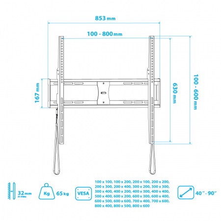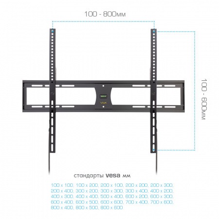 - Расстояние между отверстиями для крепления к телевизору: 200x200, 300x300, 400x200, 400x400, 600x400, 800x600 мм